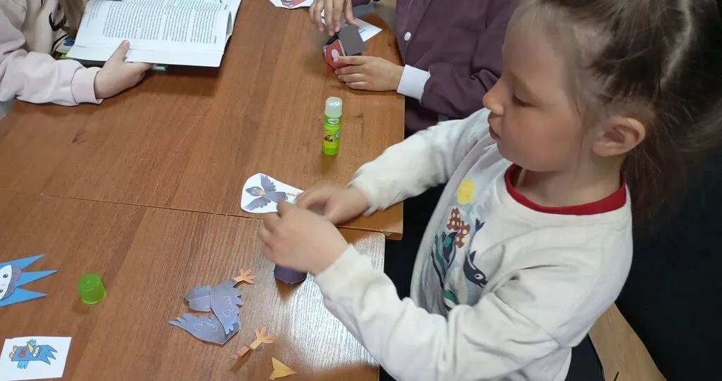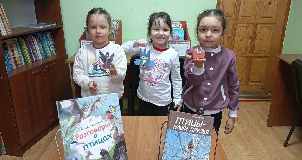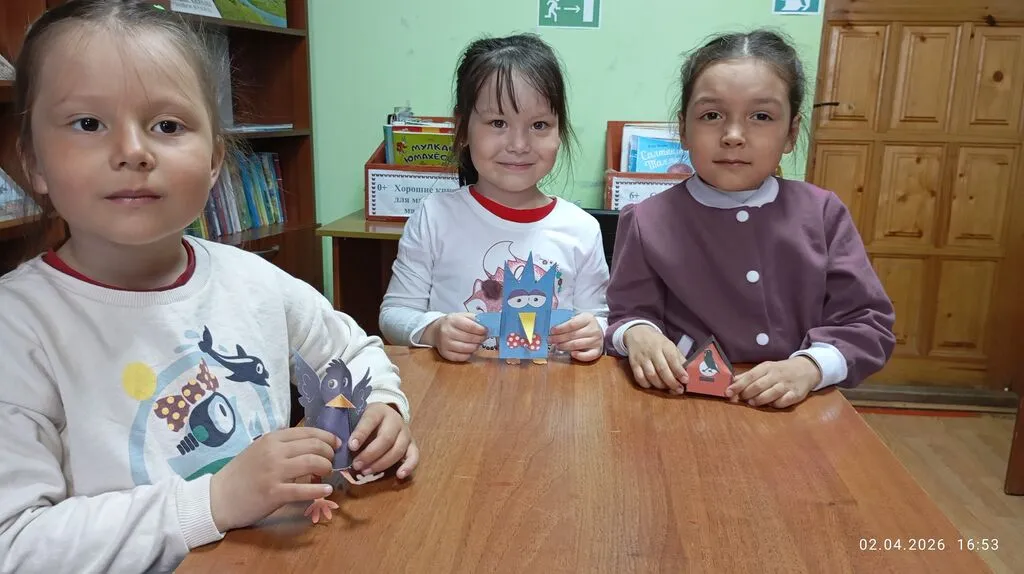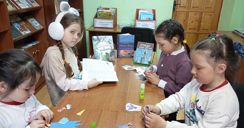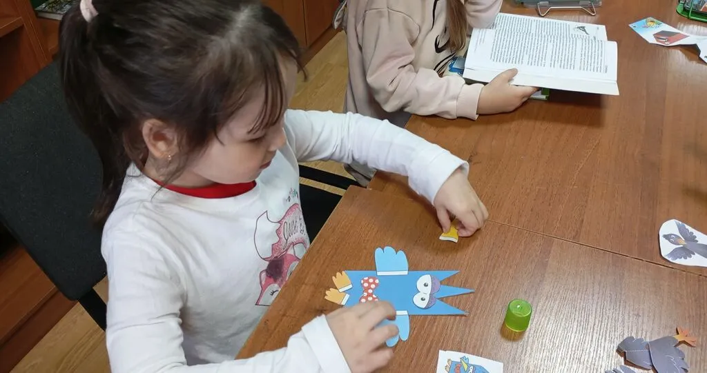 Дети активно участвовали в беседе: делились своими наблюдениями, отгадывали загадки про птиц и с радостью отвечали на вопросы викторины. Самые смелые даже попробовали повторить звуки, которые издают разные пернатые — получилось очень забавно! Затем началась самая весёлая часть встречи — творческая. Библиотекарь подготовила для ребят яркие шаблоны разных птиц. Дети с воодушевлением принялись за дело: аккуратно вырезали шаблоны, подбирали цвета, клеили детали и дополняли своих птиц мелкими элементами — глазками, пёрышками, узорами. Каждый участник создал свою уникальную птицу. В процессе работы ребята общались, помогали друг другу и радовались результатам. В итоге получились яркие и самобытные композиции. Дети с гордостью демонстрировали друг другу готовые аппликации и фотографировались со своими творениями.