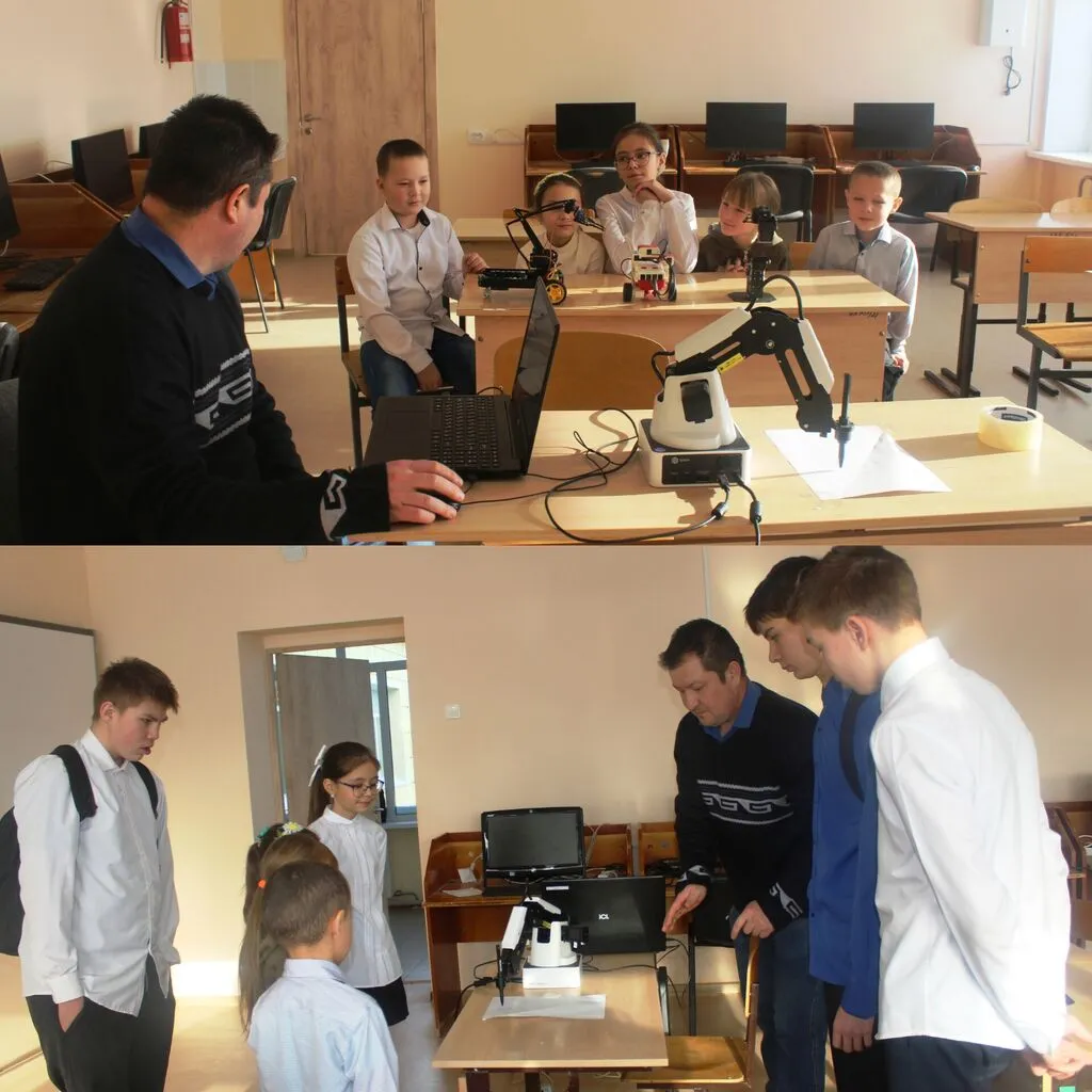 Затем Андрей Константинович познакомил детей с набором аппаратной платформы Dobot и предложил им самим попробовать управлять устройством. Учитель подробно объяснил, как работает манипуляционный робот и какие задачи он может выполнять.
