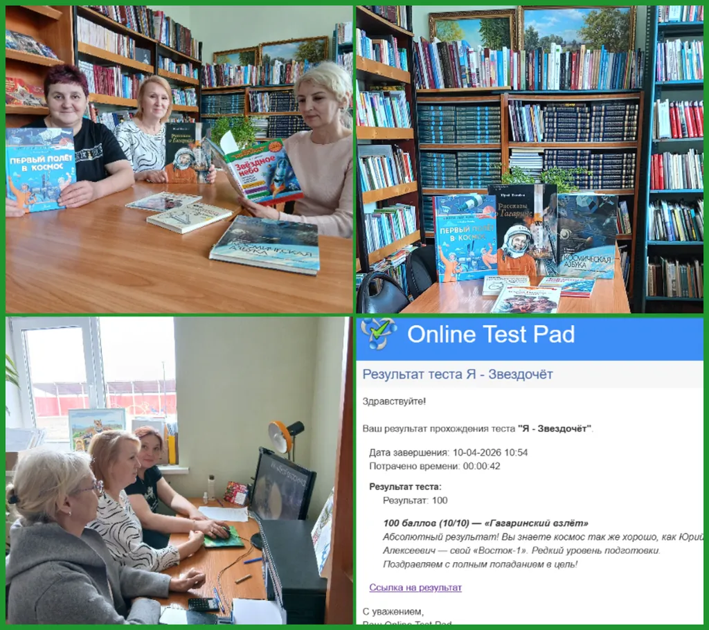 10 апреля в рамках республиканской Недели космических знаний, приуроченной к Дню космонавтики, в Буинской сельской библиотеке централизованной библиотечной системы Ибресинского муниципального округа состоялось онлайн-тестирование «Я – Звездочёт». Проверить свои знания о космонавтах, планетах и космических явлениях смогли пользователи библиотеки, которым предстояло ответить на 10 вопросов о реальных фактах (собаки, гекконы, корабли, рекорды и, конечно, Гагарин). Для посетителей разного возраста была подготовлена книжная выставка «Вперёд — к звёздам!». Экспозиция включает научно-популярные, энциклопедические и литературно-художественные издания, среди них книги о первом полёте человека в космос, о покорителях космоса, издания по астрономии. Для расширения кругозора в участников была представлена познавательная презентация, посвящённая Неделе космических знаний.