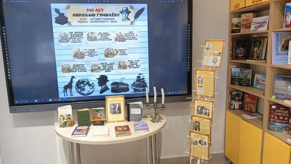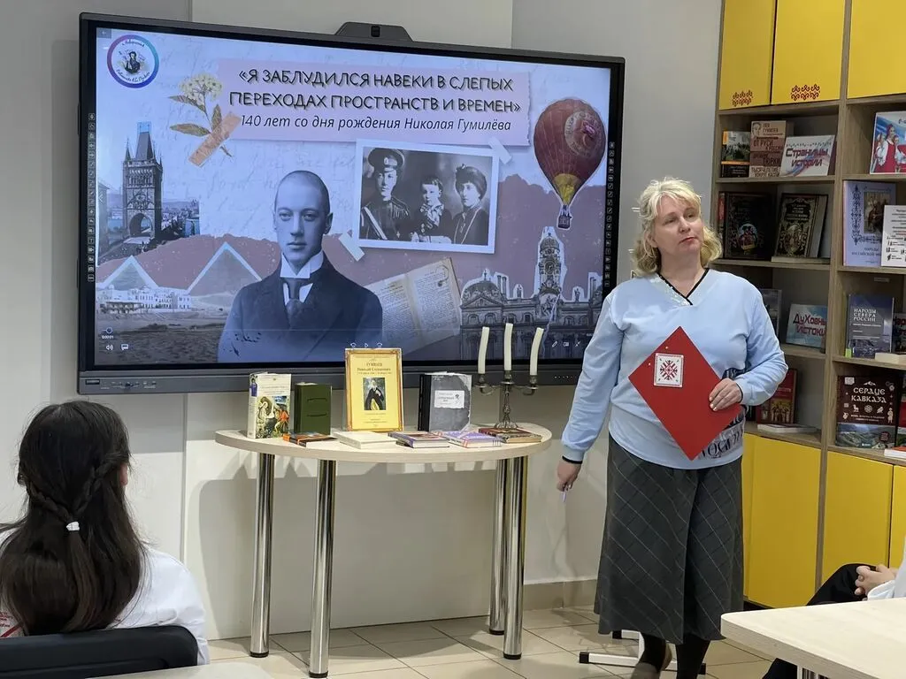 К 140-летию со дня рождения Николая Гумилева главный библиотекарь отдела обслуживания О. В. Прохорова подготовила насыщенную программу. Участники увидели короткий видеоролик о жизни и творчестве поэта, познакомились с выставкой «Жизнь и творчество поэта Н. Гумилева». Особое внимание было уделено истории любви Николая Гумилева и Анны Ахматовой, а также их сыну – знаменитому историку Льву Гумилеву. Библиотекарь представила видеоролики с современными, романтичными и красивыми песнями и романсами на стихи поэта.